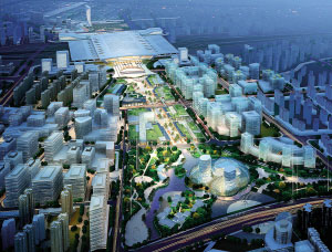 东站枢纽的规划,经过从概念到方案,再从方案到城市设计并优化规划的过程,一座庞大的交通枢纽暨城市综合体汇集国内外众多的智力资源,脱颖而出。2007年1月法国AREP公司方案提出东站枢纽零换乘、集约化等概念之后,当年11月,原铁道部鉴定中心启动了杭州铁路东站概念设计方案国际招标工作。为了寻求一个满意的方案,铁路和地方部门的专家和工作人员在一起工作了近半个月才完成了招标文件。通过筛选41家国内外知名设计单位,推选了4个方案进行进一步优化。2008年3月,这4个方案在“红楼”与市民见面,与专家的意见相符,一个突破传统火车站模式的方案拔得头筹,这就是目前已经由蓝图变为现实的中南院方案。这座庞大的现代化建筑一下子奠定了城东新城的地标,而新城的建设者们又敏锐地意识到了红花还需绿叶陪衬,站房像一座巨大的屋盖罩在站场上,更大更美的东西广场更像一座巨大的城市公园,颠覆了传统火车站区的形象。继续向东西两侧延伸拓展的生态轴线,则构成了城东新城的灵魂。
