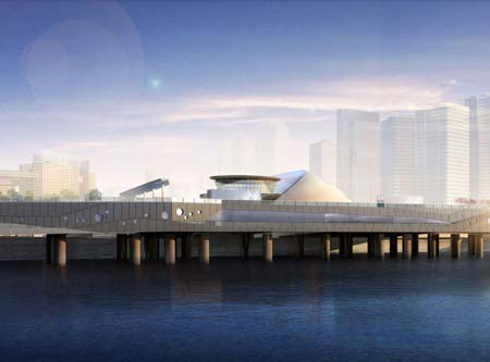 钱江新城城市阳台是新城核心区块环境建设的标志性工程,它具有休闲、景观、交通、服务等多重功能,计划于2008年完工。
