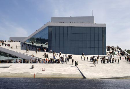 于2008年投入使用的奥斯陆歌剧院就像一座冰山一样在奥斯陆拔地而起。倾斜的大理石天台对市民开放,下面是一个有1350个座位的礼堂。奥斯陆歌剧院因其当代的建筑风格而荣获2009年度欧洲建筑密斯-凡-德-罗奖。