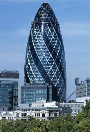小黄瓜因其独特的圆锥形而得名,这座办公大楼位于伦敦金融区圣玛丽斧街30号,于2004年投入使用。虽然大厦是圆锥形,但是整栋大厦只有一块弯曲的透镜状的玻璃用来覆盖顶部。大厦高600英尺(90米),有40层,内部进驻的企业是保险公司和其他金融公司。