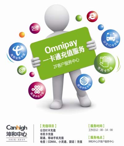 坤和中心与杭州市民卡、公交IC卡、自行车租用系统的开发公司合作,推出OmniPay一站式便民服务系统充值新服务,服务点位于坤和中心2F客服中心,现已开通的充值服务有:杭州公交IC卡充值,市民卡充值,浙江移动、浙江联通手机充值和电信(CDMA、小灵通、固话)充值等,于每个工作日的12:00-14:00向租户开放使用。