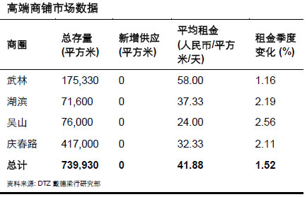 新供应的缺乏以及又一传统旅游高峰的来临,使得商铺租赁量进一步增加。本季度商铺整体平均入住率为99.90%,达到了自2010年第1季度以来的新高,环比增加1.94个百分点。在此影响下,杭州第3季度末商铺整体平均租金环比上涨1.52%,为每天每平方米41.88元(6.54美元)。