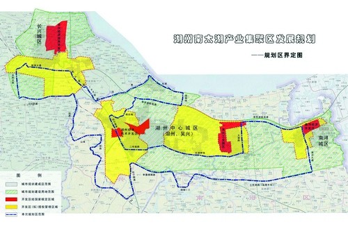 规划具体分为规划控制区、重点规划区和“十二五”开发建设区3个层次;规划控制区东起南浔大道,西至长兴县新长和公路,南到外环南路,北滨太湖南岸;重点规划区即产业集聚区“十二五”时期(近期)的重点启动区,主体部分是“十二五”可开发建设的区块,规划面积62.73平方公里;“十二五”开发建设区即以“十二五”时期可供产业集聚区开发需要的新增建设用地总量而确定的开发建设区块,扣除不可建设区外,新增建设面积29.98平方公里。