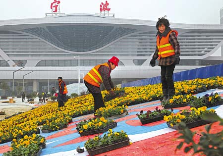 昨天下午,海曙区的园林工人在铁路宁波站南广场摆放花卉。连日来,该区园林部门布置了十万盆三色堇等花卉,静待铁路宁波站明天启用。