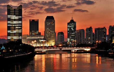 坤和中心在落霞中高高耸立,同时拥览运河与西湖景观。