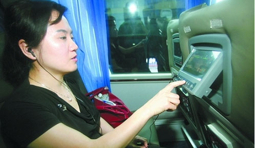 “这叫MOD座椅背靠屏电视系统,以前它只在飞机上才会出现,这次算是‘着陆’了。”杭州长运工作人员说,乘客在上车前,可以拿到一副消毒过的耳塞,旅途中可以随意点播自己想看的节目,比如《提前看世博》的短片、热门的电视剧或电影、流行音乐MTV等。另外,椅背上还放置了世博手册,可以提前了解世博游玩攻略。