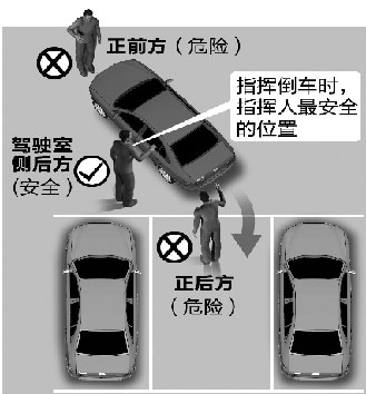 第二,保持安全距离。指挥倒车时,切忌与车辆靠得太近。指挥中大型车辆(越野车、巴士、卡车)时尤其如此。去年年末,广西一槽罐车司机在倒车时,将正在指挥倒车的同伴卷入车底。安全距离究竟保持多少,要根据车辆的具体大小、速度来定。