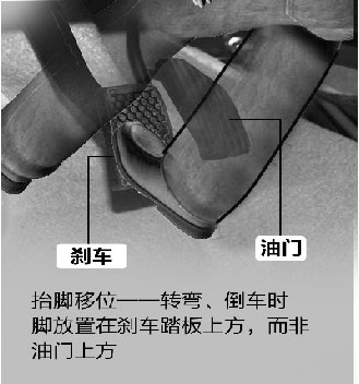 三,油门踩得比刹车多。很多人在停车时,为了方便省时,常常采用“加油门进库”的方法。而正是这种错误的习惯,引发了许多悲剧。危险时,司机总是下意识猛踩离脚最近的踏板,这也是“油门当刹车踩”的根源。为了防止油门当刹车,做到提前“抬脚移位”很重要——即转弯、倒车时,应保持车辆怠速移动状态,脚放置在刹车踏板上方。一旦紧急情况发生,就可以很方便地踩下刹车。