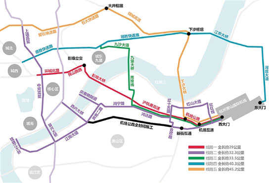 线路三(九堡大桥通道限高2.5米):城东、九堡区域进出机场通过德胜快速路(或艮山东路)—九沙大道—九堡大桥—九堡大桥南接线—弘慧路—学知路—高新三路—鸿达路通道—机场西大门,全长约33.5公里;