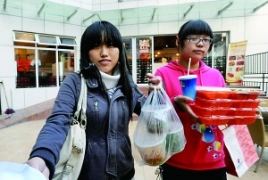 江北北城天街,两个上班族按照同事复印的“10元午餐地图”,为办公室同事购买10元午餐。
